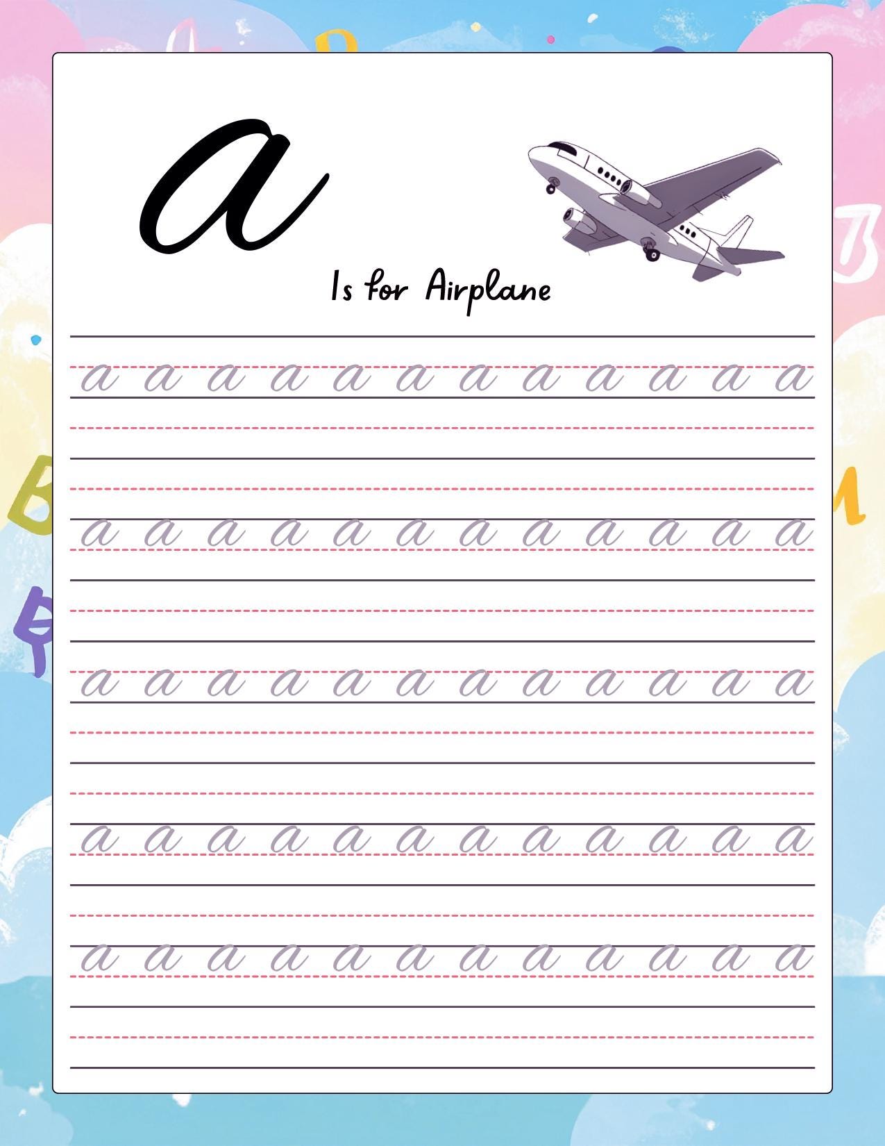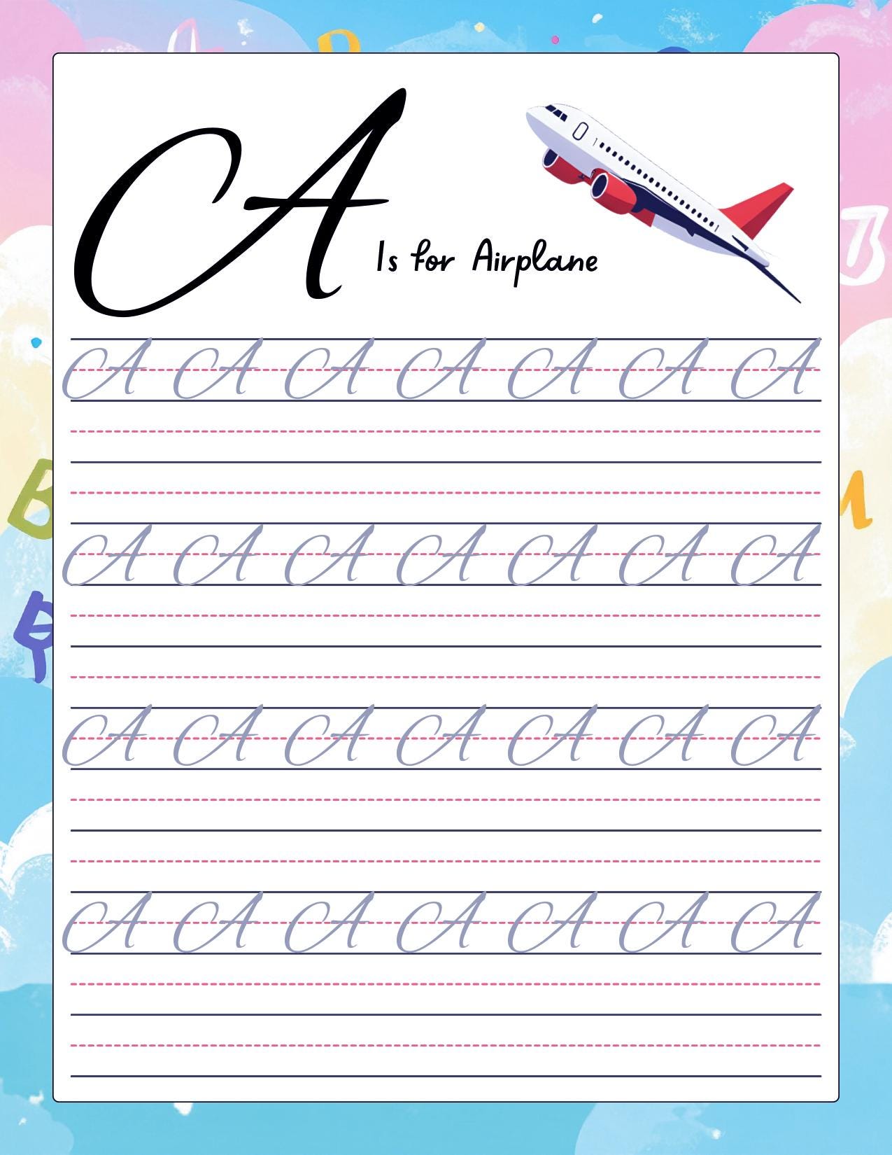 🌟 What Makes This Workbook Special?🔤 Complete A-Z Practice: Comprehensive practice for both uppercase and lowercase cursive letters, ensuring your child masters the entire alphabet.🎨 Fun Visual Associations: Every letter is paired with an adorable, kid-friendly illustration to build vocabulary and keep attention high—like "A Is for Airplane" , "B Is for Balloon" , and "C Is for Car"!✍️ Step-by-Step Learning: Pages feature dotted, guided lines to help kids learn the proper flow and direction of each letter.🚀 Builds Confidence: After tracing, children get dedicated "Practice Your Own" pages for every letter, allowing them to test their new skills independently and build real confidence.🧸 Joyful Design: A beautifully illustrated, welcoming cover featuring happy learners sets a positive tone right from the start!Perfect For:Homeschooling parents looking for structured handwriting curriculum.Teachers needing supplementary classroom materials.Summer bridge activities or after-school practice to give your child an academic edge.📥 Instant Digital Download
